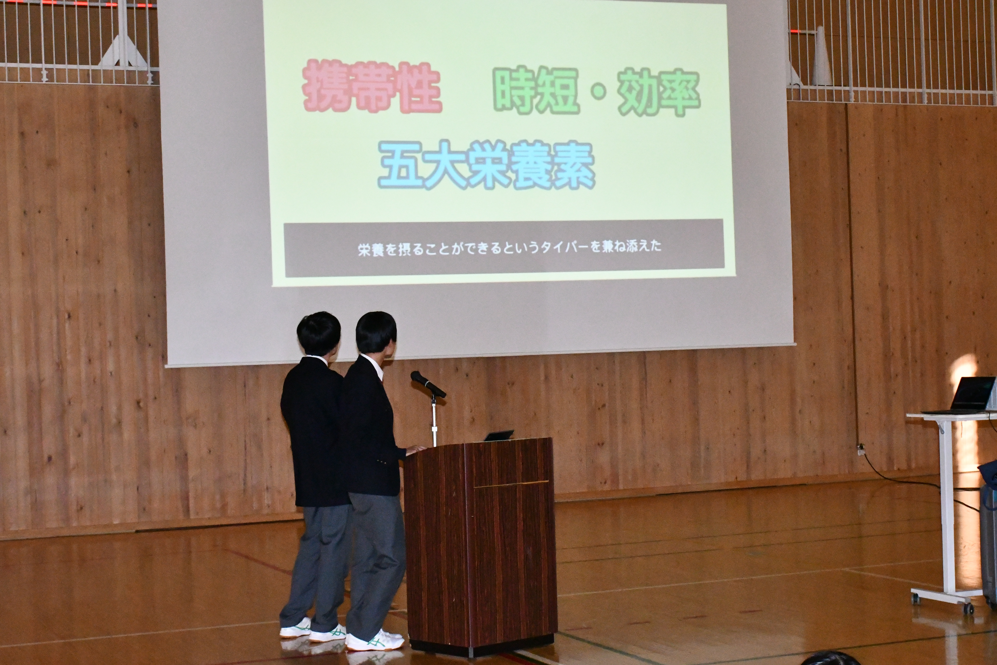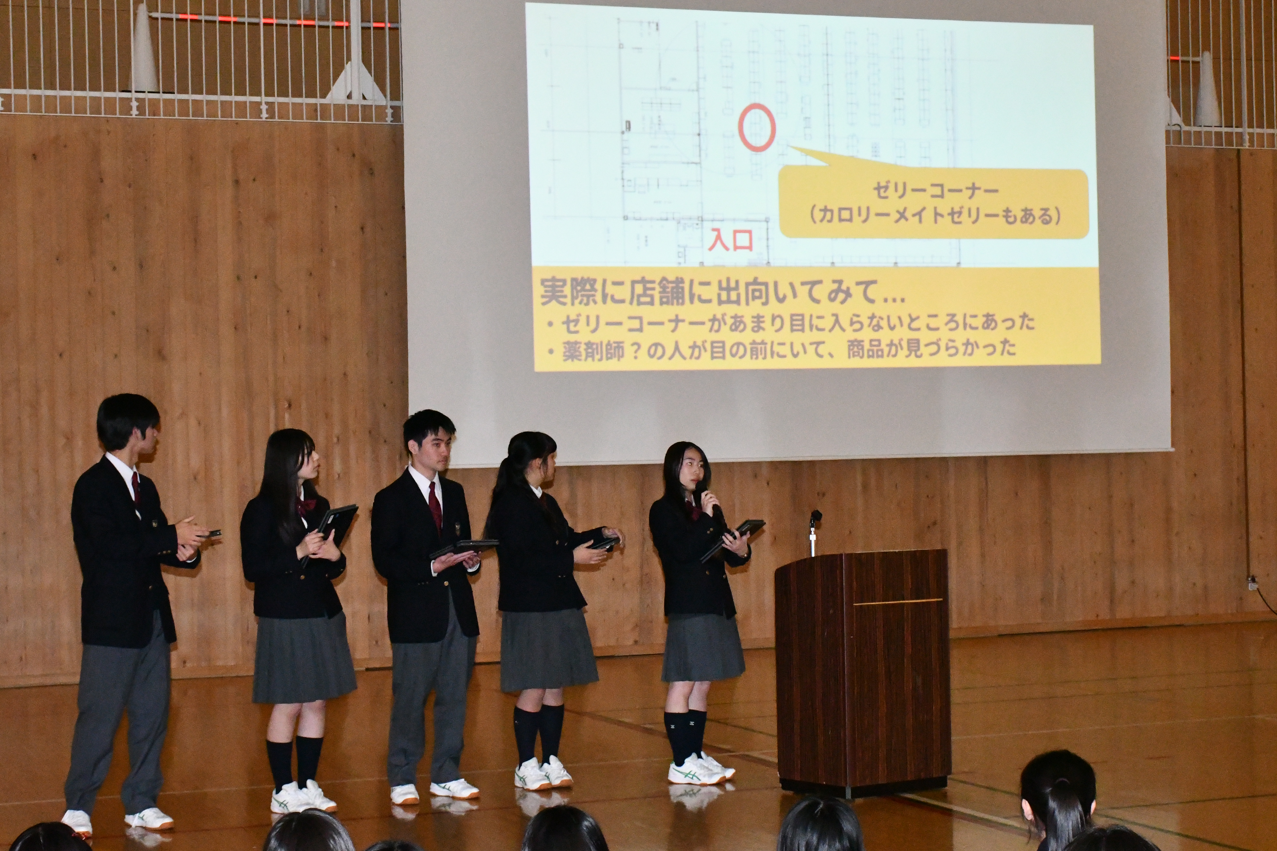 発表会当日は、校長先生と副校長先生、そして大塚製薬・クスリのマルエからお越しいただいたスタッフの方々に発表を聴いていただきました。