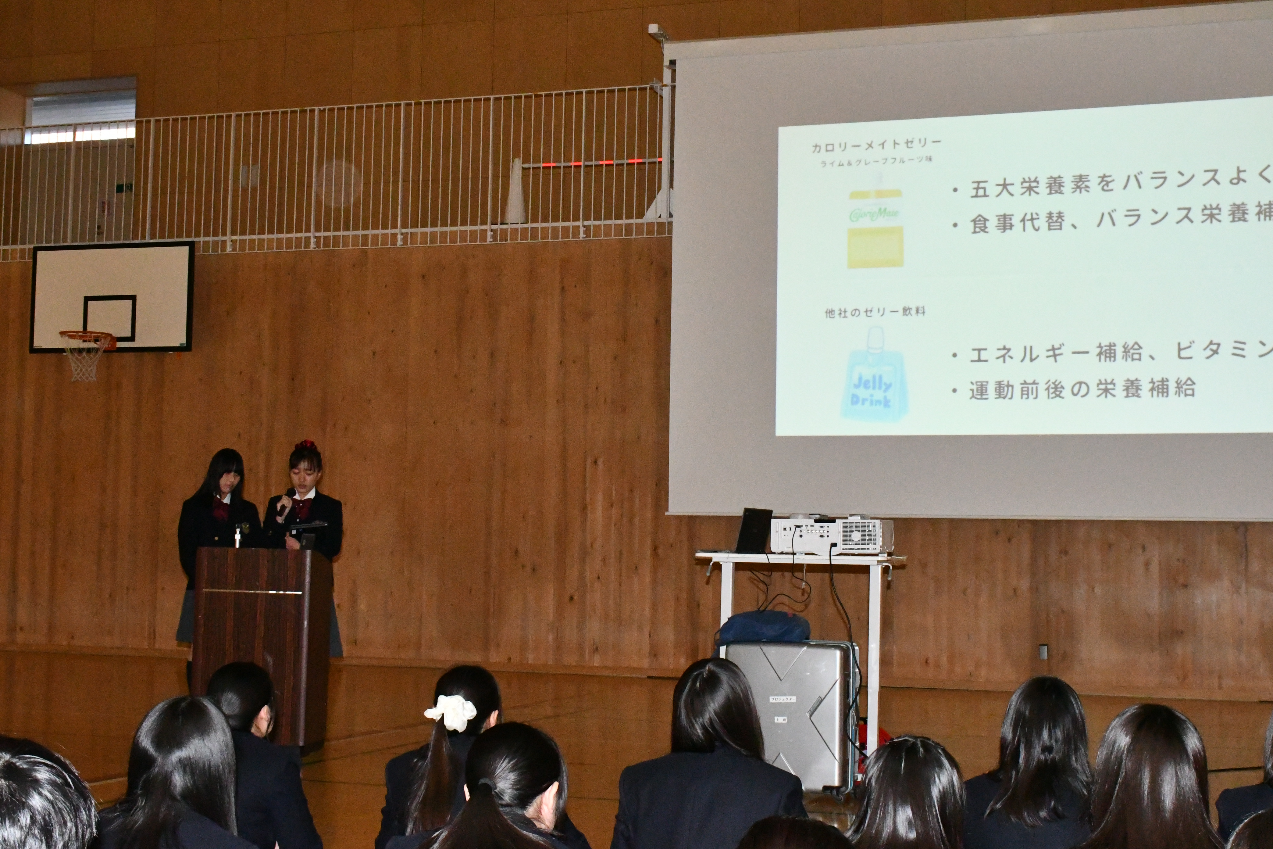 クラスごとに、前橋市内に実際に存在する店舗での販売を想定して、カロリーメイトゼリーのマーケティングについて考察、スライド資料などを用いて発表する。